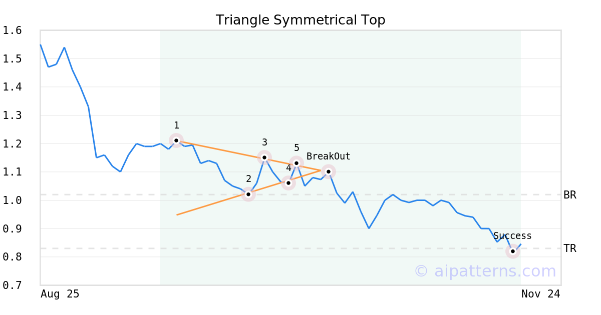 On October 09, 2025, A.I.dvisor detected a Triangle Symmetrical Top Pattern (Bearish) for Trinity Biotech plc (TRIB, $1.13). 6 days later, on October 15, 2025, A.I.dvisor confirmed the Bearish pattern, setting a target price of the stock. On November 17, 2025, the stock hit the target price of $0.83 – resulting in a +2 gain for traders who shorted the stock on the pattern detection date.