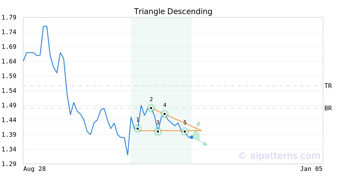 A.I.dvisor detected a bullish Triangle Descending pattern for TRSG stock. This pattern was detected on November 05, 2025 . The odds of reaching the target price are 6.