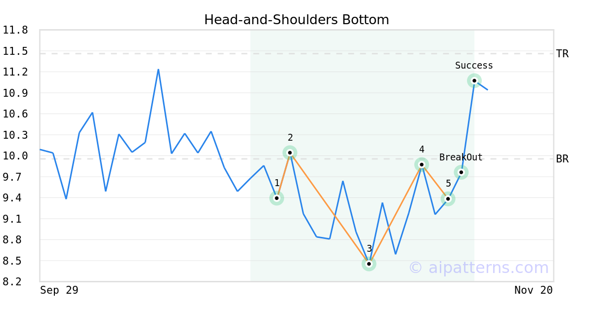 On November 11, 2025, A.I.dvisor detected a Head-and-Shoulders Bottom Pattern (Bullish) for GraniteShares 2x Short TSLA Daily ETF (TSDD, $9.38). On November 12, 2025, A.I.dvisor confirmed the Bullish pattern, setting a target price of $11.46. 1 day later, on November 13, 2025, TSDD reached the target price resulting in a +1 for traders who took a long position in the stock.