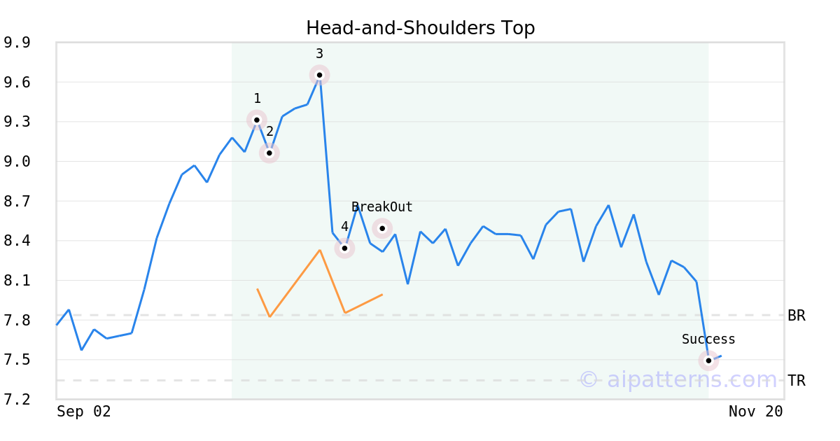 On October 08, 2025, A.I.dvisor detected a Head-and-Shoulders Top Pattern (Bearish) for YieldMax TSLA Option Income Strategy ETF (TSLY, $7.99). On October 08, 2025, A.I.dvisor confirmed the Bearish pattern, setting a target price of the stock. On November 13, 2025, the stock hit the target price of $7.34 – resulting in a gain for traders who shorted the stock on the pattern detection date.