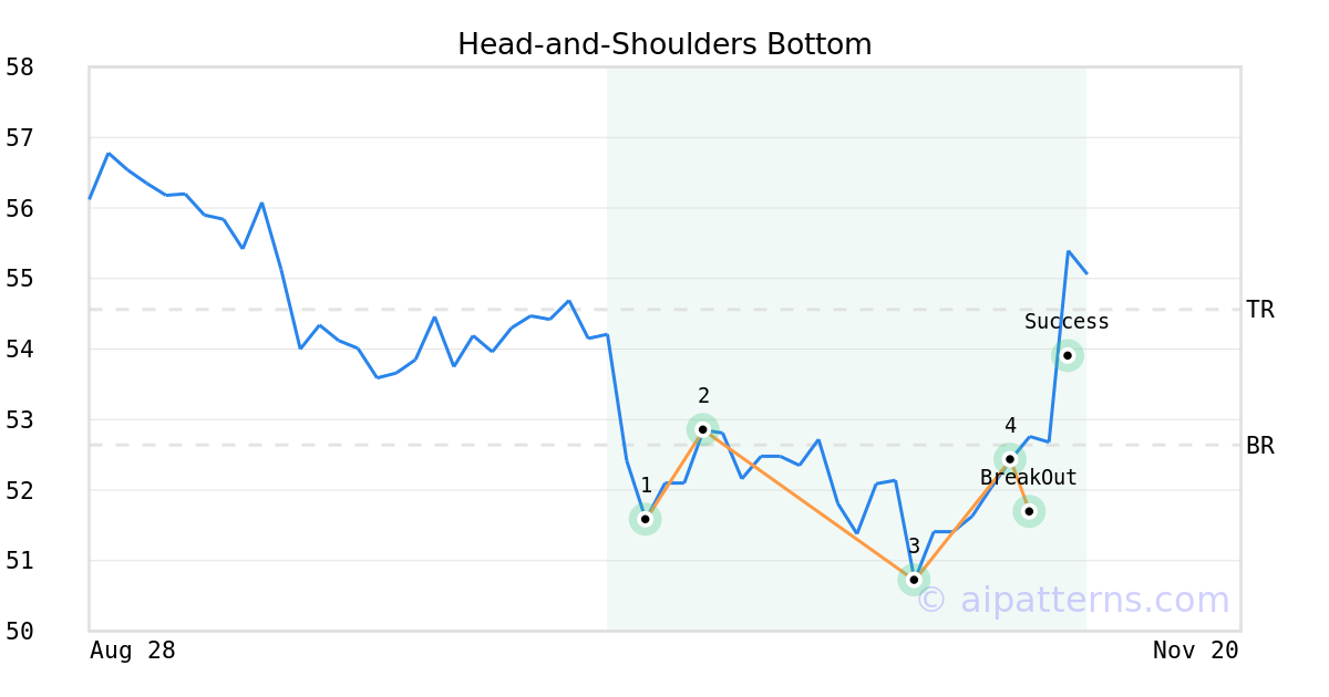 On November 06, 2025, A.I.dvisor detected a Head-and-Shoulders Bottom Pattern (Bullish) for Tyson Foods (TSN, $51.69). On November 06, 2025, A.I.dvisor confirmed the Bullish pattern, setting a target price of $54.56. 4 days later, on November 10, 2025, TSN reached the target price resulting in a for traders who took a long position in the stock.