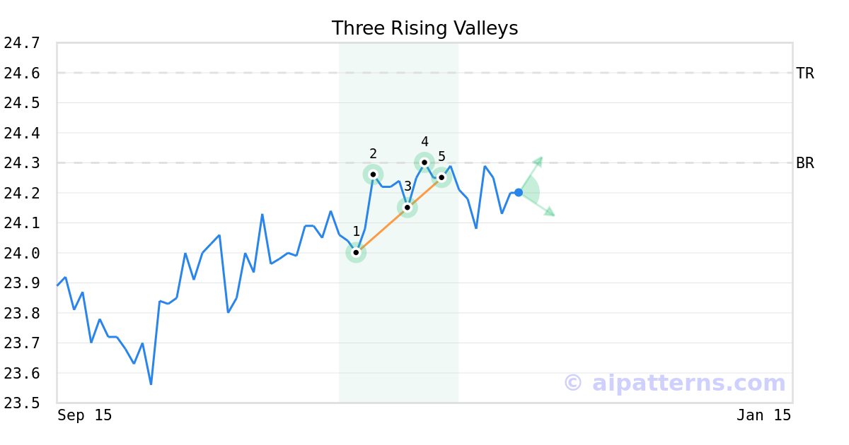 The Three Rising Valleys pattern forms when three minor Lows (1, 3, 5) are arranged along an upward sloping trend line.
