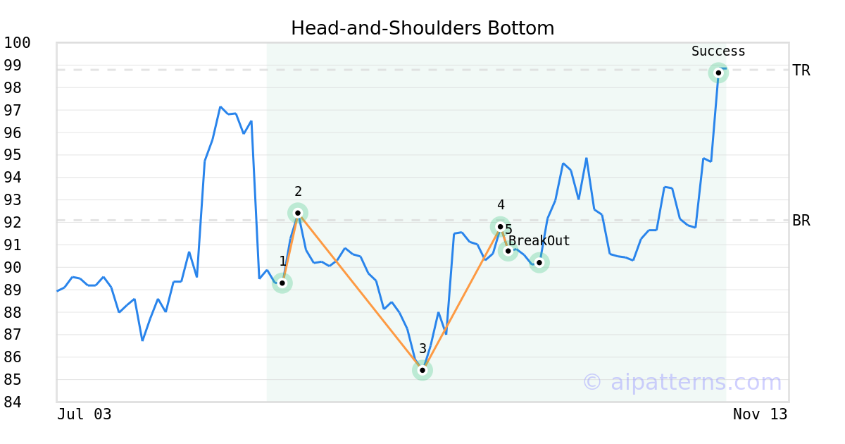 On September 25, 2025, A.I.dvisor detected a Head-and-Shoulders Bottom Pattern (Bullish) for CVR Partners LP (UAN, $90.71). On October 01, 2025, A.I.dvisor confirmed the Bullish pattern, setting a target price of $98.79. 33 days later, on November 03, 2025, UAN reached the target price resulting in a for traders who took a long position in the stock.