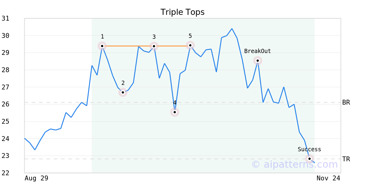 On October 15, 2025, A.I.dvisor detected a Triple Tops Pattern (Bearish) for Ultra Clean Holdings (UCTT, $29.42). 19 days later, on November 03, 2025, A.I.dvisor confirmed the Bearish pattern, setting a target price of the stock. On November 17, 2025, the stock hit the target price of $22.82 – resulting in a +2 gain for traders who shorted the stock on the pattern detection date.