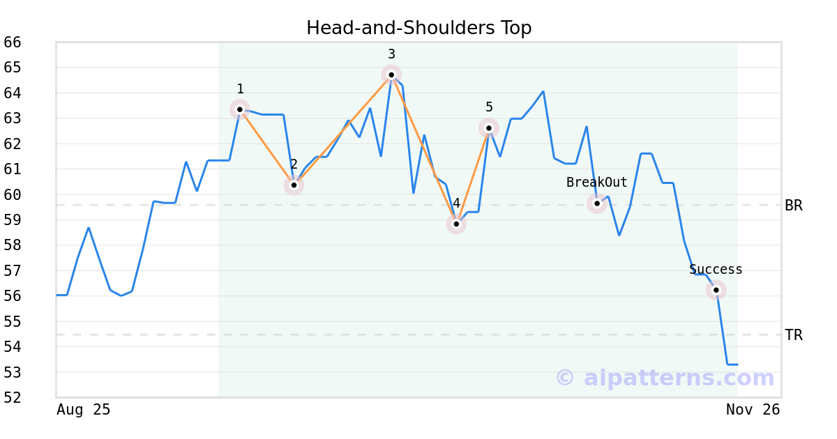 On October 21, 2025, A.I.dvisor detected a Head-and-Shoulders Top Pattern (Bearish) for ProShares Ultra Nasdaq Cybersecurity (UCYB, $62.60). 14 days later, on November 04, 2025, A.I.dvisor confirmed the Bearish pattern, setting a target price of the stock. On November 19, 2025, the stock hit the target price of $54.48 – resulting in a +1 gain for traders who shorted the stock on the pattern detection date.