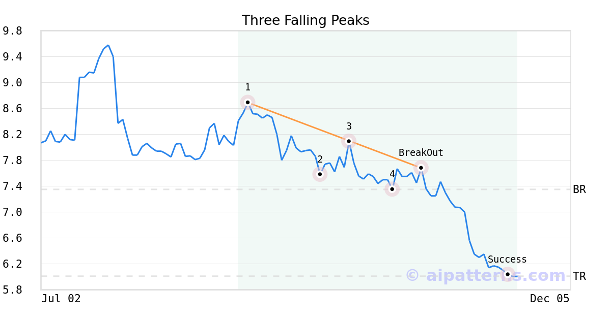 On October 23, 2025, A.I.dvisor detected a Three Falling Peaks Pattern (Bearish) for United-Guardian (UG, $7.68). On October 23, 2025, A.I.dvisor confirmed the Bearish pattern, setting a target price of the stock. On November 18, 2025, the stock hit the target price of $6.01 – resulting in a +2 gain for traders who shorted the stock on the pattern detection date.
