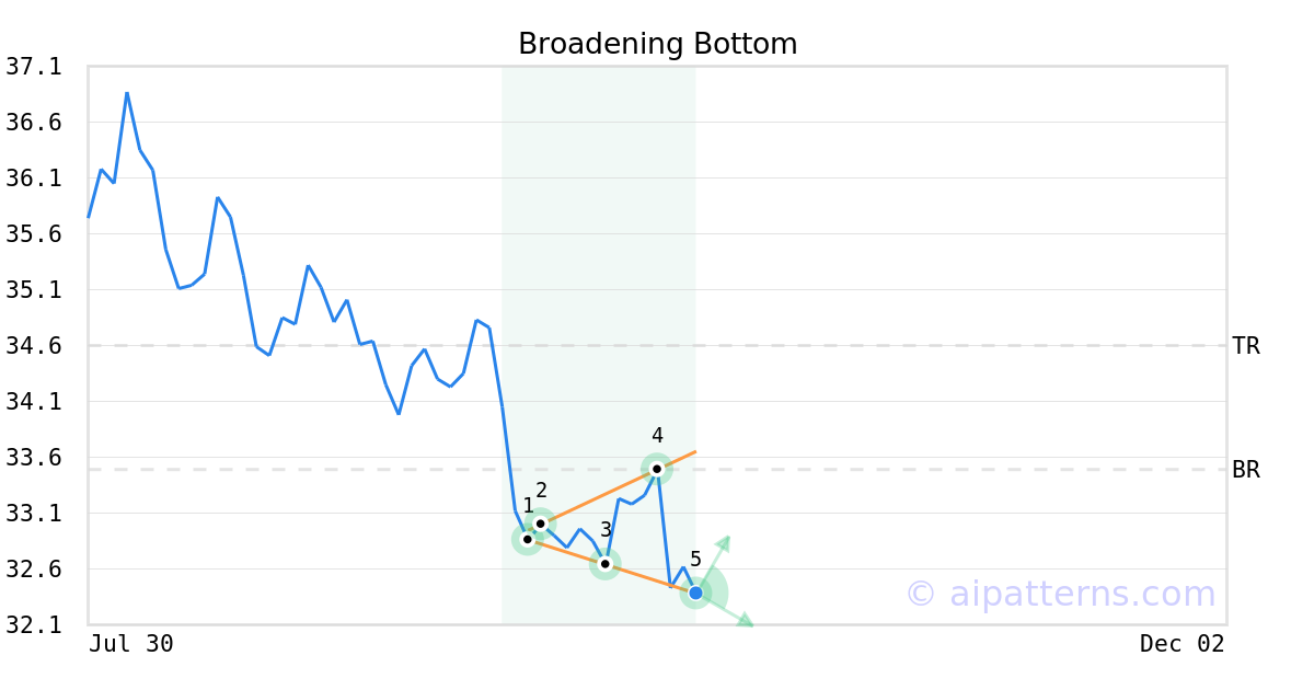 UGI may jump back above the lower band and head toward the middle band. Traders may consider buying the stock or exploring call options. In of 35 cases where UGI's price broke its lower Bollinger Band, its price rose further in the following month. The odds of a continued upward trend are .