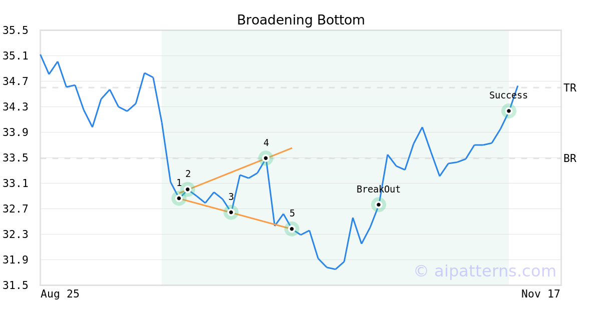 On October 06, 2025, A.I.dvisor detected a Broadening Bottom Pattern (Bullish) for UGI Corp (UGI, $32.38). On October 20, 2025, A.I.dvisor confirmed the Bullish pattern, setting a target price of $34.60. 21 days later, on November 10, 2025, UGI reached the target price resulting in a for traders who took a long position in the stock.