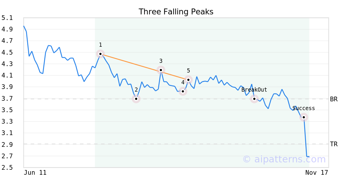 On September 08, 2025, A.I.dvisor detected a Three Falling Peaks Pattern (Bearish) for Unisys Corp (UIS, $4.02). 32 days later, on October 10, 2025, A.I.dvisor confirmed the Bearish pattern, setting a target price of the stock. On November 05, 2025, the stock hit the target price of $2.91 – resulting in a +1 gain for traders who shorted the stock on the pattern detection date.