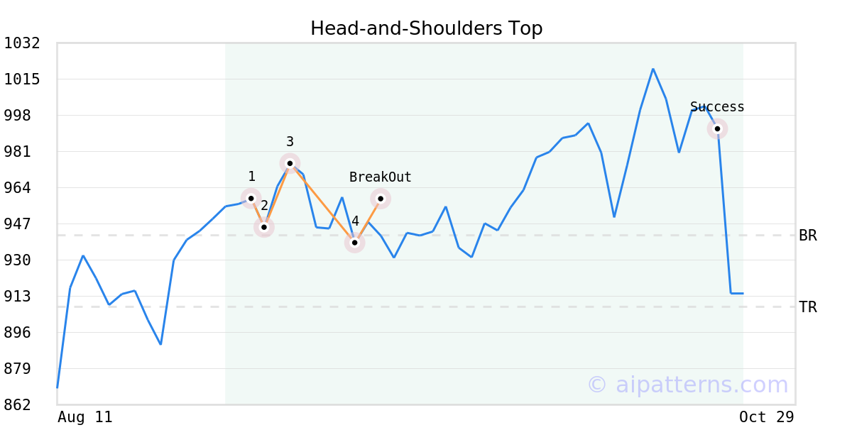 On September 16, 2025, A.I.dvisor detected a Head-and-Shoulders Top Pattern (Bearish) for United Rentals (URI, $958.65). On September 16, 2025, A.I.dvisor confirmed the Bearish pattern, setting a target price of the stock. On October 22, 2025, the stock hit the target price of $908.03 – resulting in a gain for traders who shorted the stock on the pattern detection date.