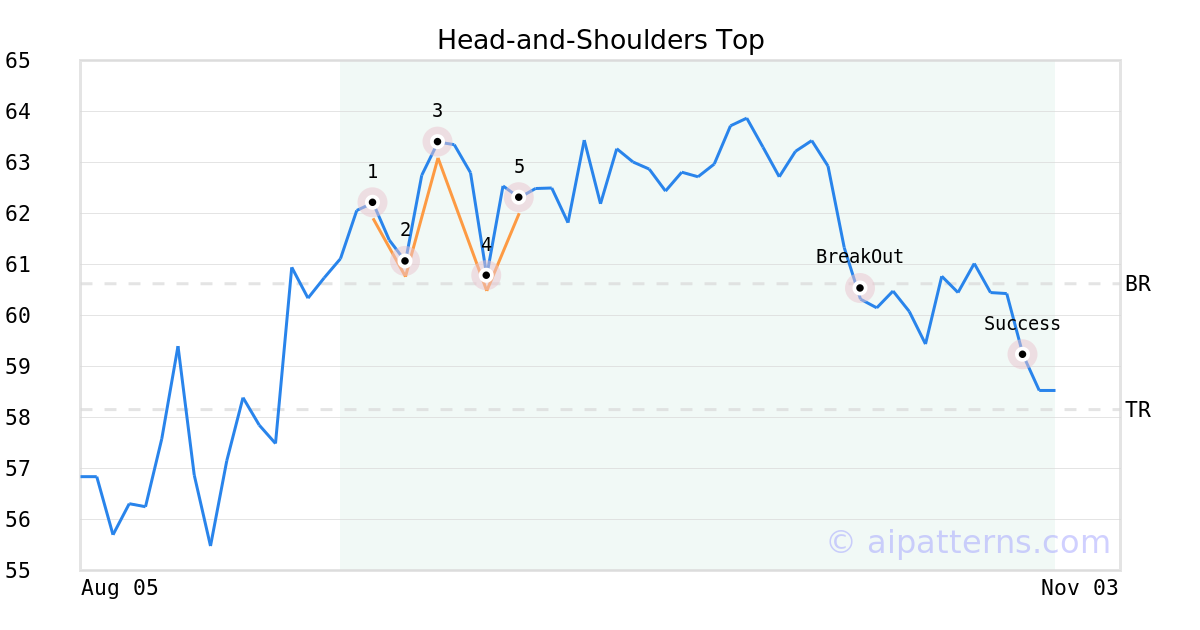 On September 12, 2025, A.I.dvisor detected a Head-and-Shoulders Top Pattern (Bearish) for Utah Medical Products (UTMD, $62.01). 31 days later, on October 13, 2025, A.I.dvisor confirmed the Bearish pattern, setting a target price of the stock. On October 27, 2025, the stock hit the target price of $58.15 – resulting in a gain for traders who shorted the stock on the pattern detection date.