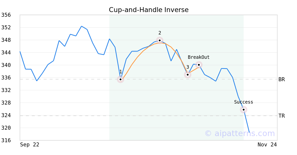 On November 05, 2025, A.I.dvisor detected a Cup-and-Handle Inverse Pattern (Bearish) for VISA (V, $339.37). On November 05, 2025, A.I.dvisor confirmed the Bearish pattern, setting a target price of the stock. On November 17, 2025, the stock hit the target price of $323.84 – resulting in a gain for traders who shorted the stock on the pattern detection date.