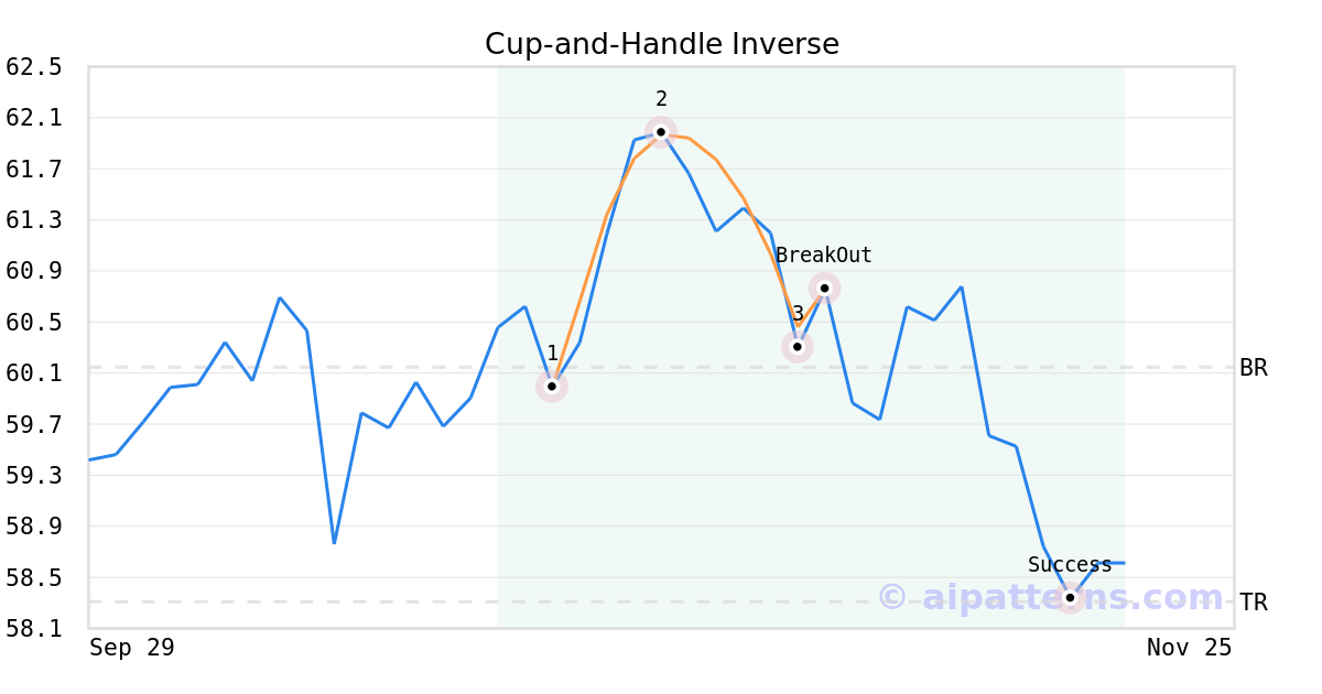 On November 05, 2025, A.I.dvisor detected a Cup-and-Handle Inverse Pattern (Bearish) for US Vegan Climate ETF (VEGN, $60.76). On November 05, 2025, A.I.dvisor confirmed the Bearish pattern, setting a target price of the stock. On November 18, 2025, the stock hit the target price of $58.31 – resulting in a gain for traders who shorted the stock on the pattern detection date.