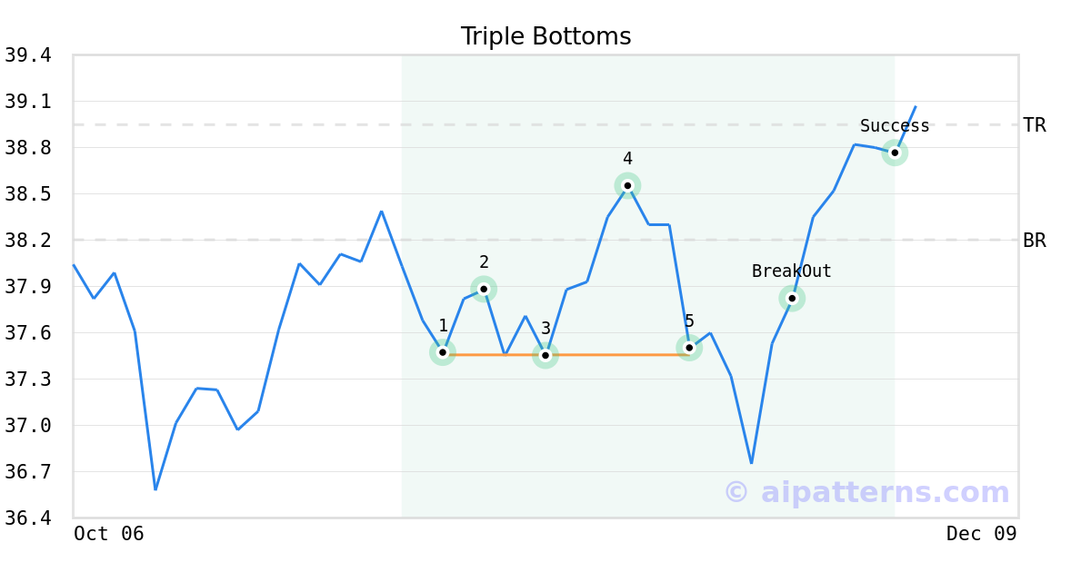 On November 17, 2025, A.I.dvisor detected a Triple Bottoms Pattern (Bullish) for VictoryShares Free Cash Flow ETF (VFLO, $37.50). On November 24, 2025, A.I.dvisor confirmed the Bullish pattern, setting a target price of $38.95. 8 days later, on December 02, 2025, VFLO reached the target price resulting in a for traders who took a long position in the stock.