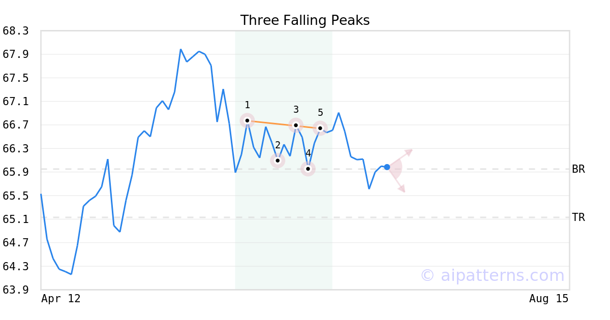 A.I.dvisor detected a bearish Three Falling Peaks pattern for VIMSX stock. This pattern was detected on June 18, 2024 . The odds of reaching the target price are 6. The Three Falling Peaks pattern forms when three minor Highs (1, 3, 5) arrange along a downward-sloping trend line. Consider selling the security short or buying a put option at the downward breakout price level. When trading, wait for the confirmation move, which is when the price moves below the breakout level.