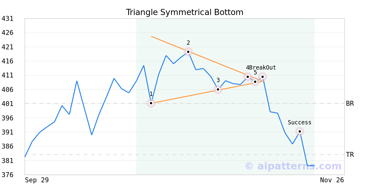 On November 11, 2025, A.I.dvisor detected a Triangle Symmetrical Bottom Pattern (Bearish) for Valmont Industries (VMI, $408.70). 1 day later, on November 12, 2025, A.I.dvisor confirmed the Bearish pattern, setting a target price of the stock. On November 19, 2025, the stock hit the target price of $383.09 – resulting in a gain for traders who shorted the stock on the pattern detection date.