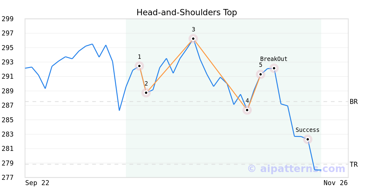 On November 10, 2025, A.I.dvisor detected a Head-and-Shoulders Top Pattern (Bearish) for Vanguard Mid-Cap ETF (VO, $291.28). 2 days later, on November 12, 2025, A.I.dvisor confirmed the Bearish pattern, setting a target price of the stock. On November 19, 2025, the stock hit the target price of $278.83 – resulting in a gain for traders who shorted the stock on the pattern detection date.