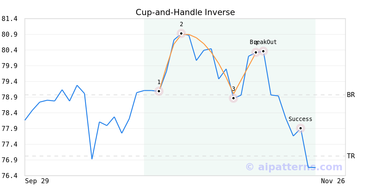 On November 11, 2025, A.I.dvisor detected a Cup-and-Handle Inverse Pattern (Bearish) for TCW Transform 500 ETF (VOTE, $80.32). 1 day later, on November 12, 2025, A.I.dvisor confirmed the Bearish pattern, setting a target price of the stock. On November 19, 2025, the stock hit the target price of $77.03 – resulting in a gain for traders who shorted the stock on the pattern detection date.