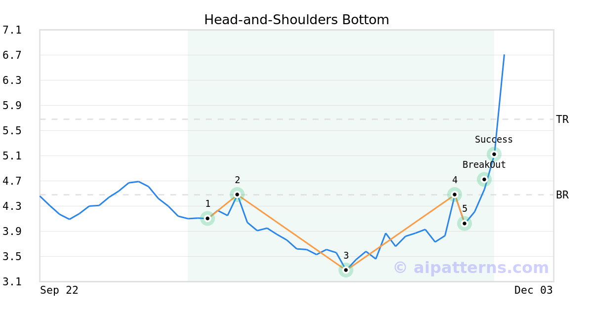 On November 20, 2025, A.I.dvisor detected a Head-and-Shoulders Bottom Pattern (Bullish) for Verrica Pharmaceuticals Inc (VRCA, $4.02). On November 24, 2025, A.I.dvisor confirmed the Bullish pattern, setting a target price of $5.68. 1 day later, on November 25, 2025, VRCA reached the target price resulting in a +2 for traders who took a long position in the stock.