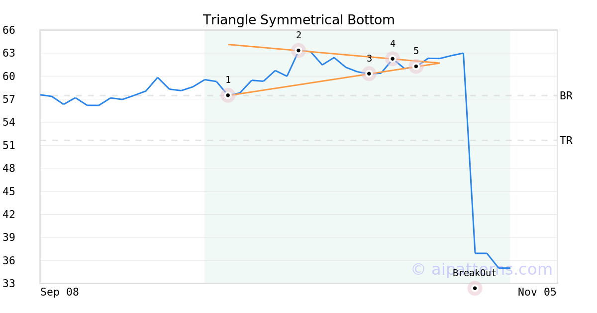 On October 22, 2025, A.I.dvisor detected a Triangle Symmetrical Bottom Pattern (Bearish) for Varonis Systems (VRNS, $61.24). 7 days later, on October 29, 2025, A.I.dvisor confirmed the Bearish pattern, setting a target price of the stock. On October 29, 2025, the stock hit the target price of $51.63 – resulting in a +4 gain for traders who shorted the stock on the pattern detection date.