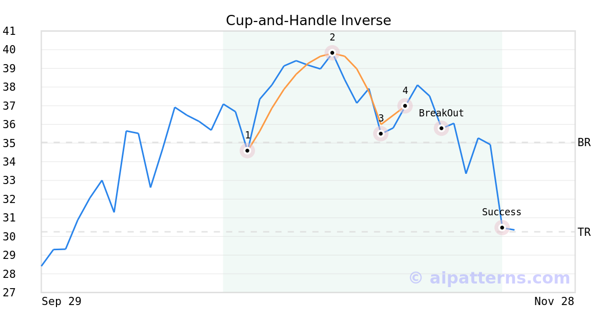 On November 10, 2025, A.I.dvisor detected a Cup-and-Handle Inverse Pattern (Bearish) for ViaSat (VSAT, $36.98). 3 days later, on November 13, 2025, A.I.dvisor confirmed the Bearish pattern, setting a target price of the stock. On November 20, 2025, the stock hit the target price of $30.25 – resulting in a +1 gain for traders who shorted the stock on the pattern detection date.