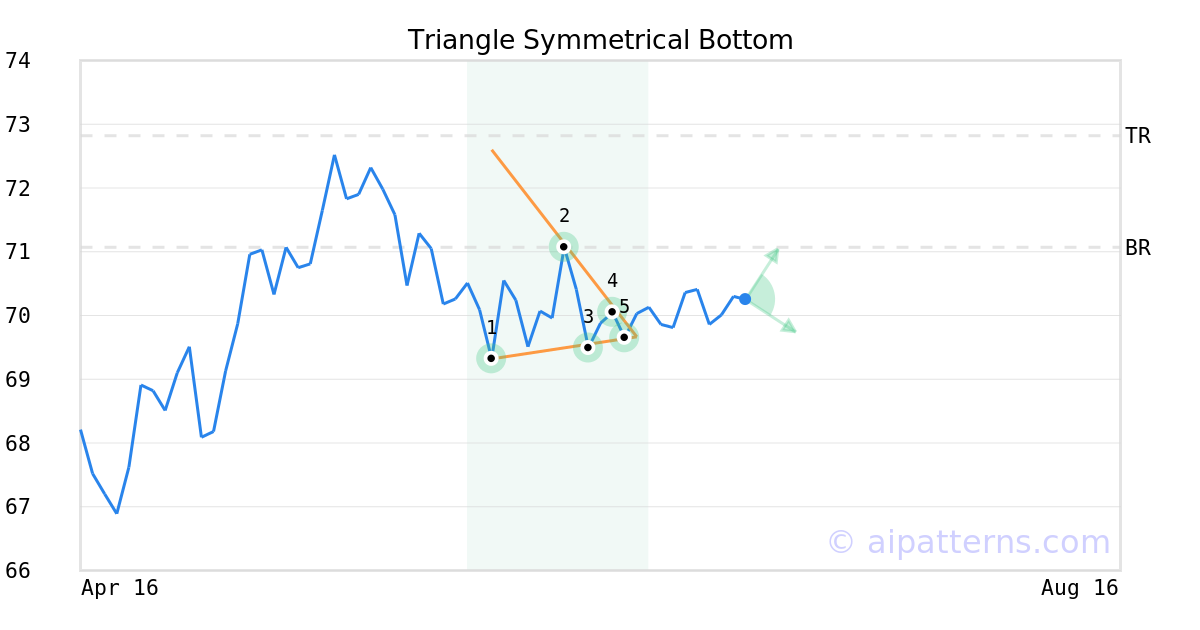 The Symmetrical Triangle Bottom pattern forms when the price of a security fails to retest a high or a low and ultimately forms two narrowing trend lines. As the support and resistance levels consolidate, they form a triangle.