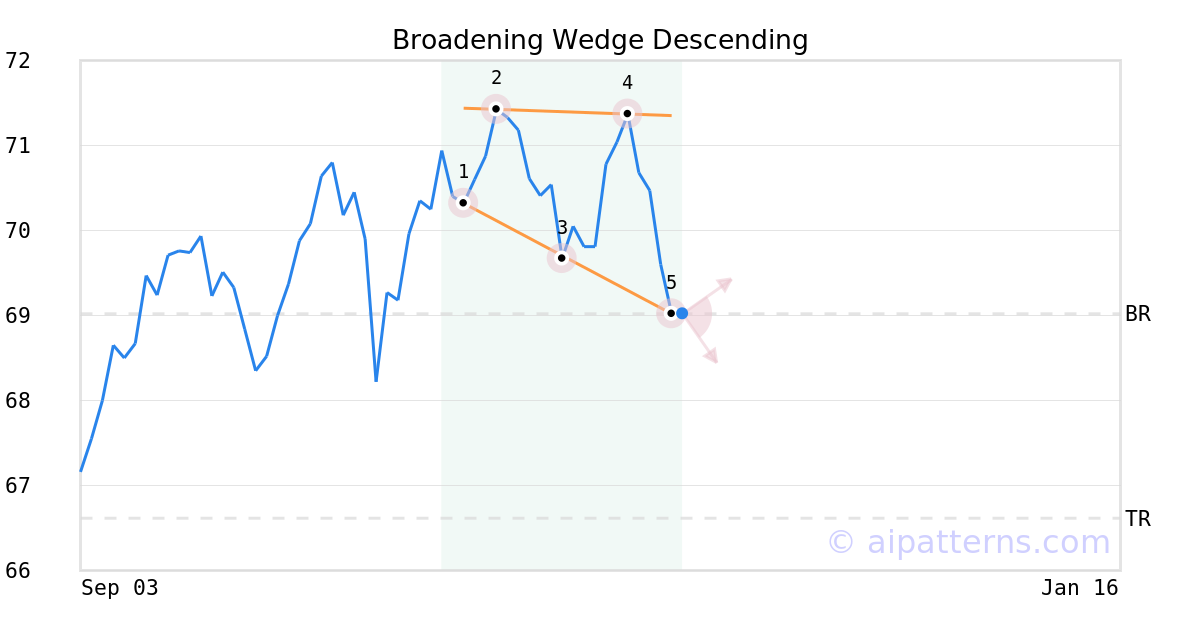 The Broadening Wedge Descending pattern forms when a security price makes lower lows (1, 3, 5) and lower highs (2, 4), forming two downward sloping lines that expand over time.
