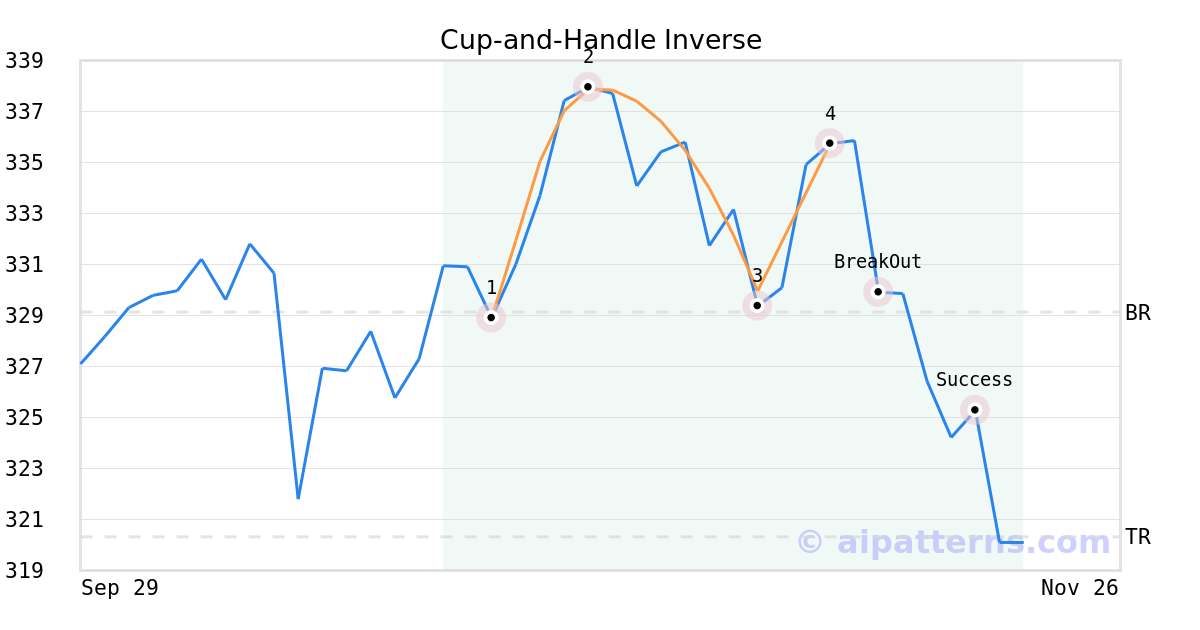 On November 11, 2025, A.I.dvisor detected a Cup-and-Handle Inverse Pattern (Bearish) for Vanguard Total Stock Market ETF (VTI, $335.74). 2 days later, on November 13, 2025, A.I.dvisor confirmed the Bearish pattern, setting a target price of the stock. On November 19, 2025, the stock hit the target price of $320.32 – resulting in a gain for traders who shorted the stock on the pattern detection date.