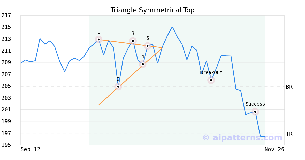 On October 20, 2025, A.I.dvisor detected a Triangle Symmetrical Top Pattern (Bearish) for Vanguard Extended Market ETF (VXF, $211.79). 17 days later, on November 06, 2025, A.I.dvisor confirmed the Bearish pattern, setting a target price of the stock. On November 19, 2025, the stock hit the target price of $196.86 – resulting in a gain for traders who shorted the stock on the pattern detection date.