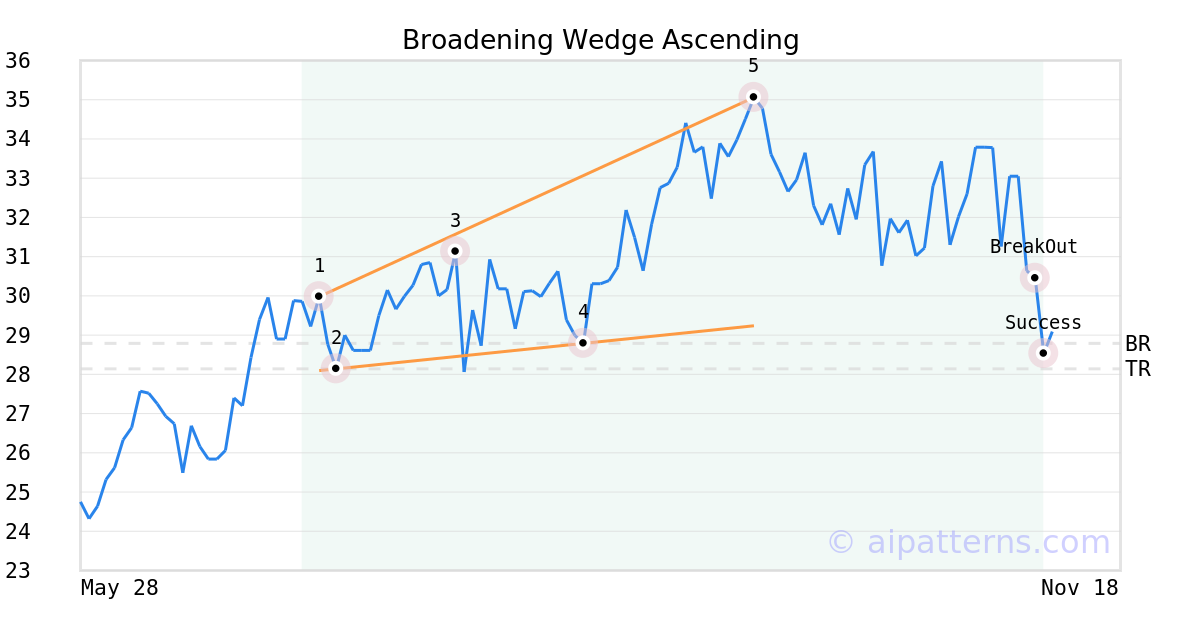 On September 19, 2025, A.I.dvisor detected a Broadening Wedge Ascending Pattern (Bearish) for Direxion Daily Dow Jones Int Bl 3X ETF (WEBL, $35.06). 47 days later, on November 05, 2025, A.I.dvisor confirmed the Bearish pattern, setting a target price of the stock. On November 06, 2025, the stock hit the target price of $28.14 – resulting in a +1 gain for traders who shorted the stock on the pattern detection date.