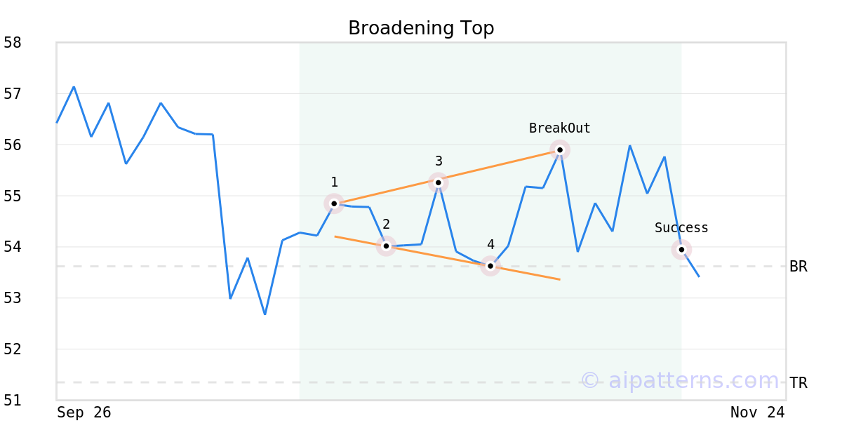 On November 06, 2025, A.I.dvisor detected a Broadening Top Pattern (Bearish) for Woori Financial Group (WF, $55.89). On November 06, 2025, A.I.dvisor confirmed the Bearish pattern, setting a target price of the stock. On November 17, 2025, the stock hit the target price of $51.35 – resulting in a gain for traders who shorted the stock on the pattern detection date.