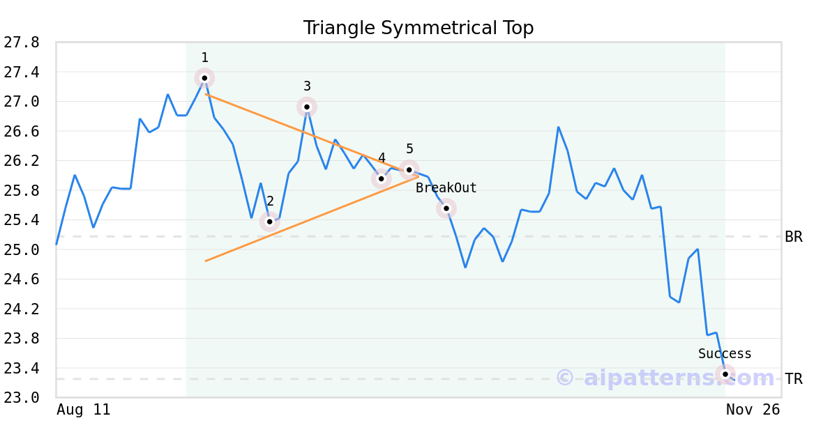 On October 03, 2025, A.I.dvisor detected a Triangle Symmetrical Top Pattern (Bearish) for World Kinect Corp (WKC, $26.07). 5 days later, on October 08, 2025, A.I.dvisor confirmed the Bearish pattern, setting a target price of the stock. On November 19, 2025, the stock hit the target price of $23.25 – resulting in a +1 gain for traders who shorted the stock on the pattern detection date.