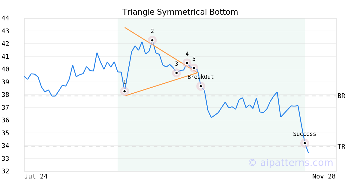On October 02, 2025, A.I.dvisor detected a Triangle Symmetrical Bottom Pattern (Bearish) for John Wiley & Sons (WLY, $39.70). 4 days later, on October 06, 2025, A.I.dvisor confirmed the Bearish pattern, setting a target price of the stock. On November 17, 2025, the stock hit the target price of $33.94 – resulting in a +1 gain for traders who shorted the stock on the pattern detection date.