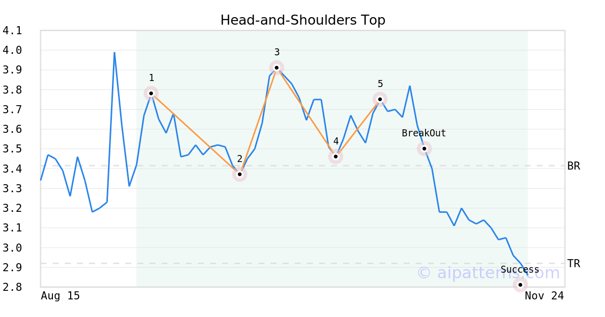 On October 21, 2025, A.I.dvisor detected a Head-and-Shoulders Top Pattern (Bearish) for Petco Health and Wellness Company (WOOF, $3.75). 8 days later, on October 29, 2025, A.I.dvisor confirmed the Bearish pattern, setting a target price of the stock. On November 17, 2025, the stock hit the target price of $2.92 – resulting in a +2 gain for traders who shorted the stock on the pattern detection date.