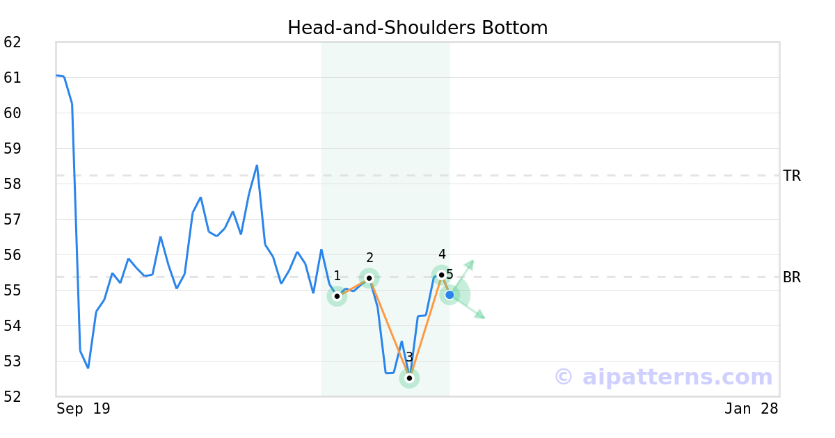 The Head-and-Shoulders Bottom pattern is formed when the price of a security creates a center trough (the inverted head, labeled 3) and the left and right inverted shoulders (1, 5). After reaching the lowest low (the Head, 3) the next low is shallower and the trend reverses course to the upside.