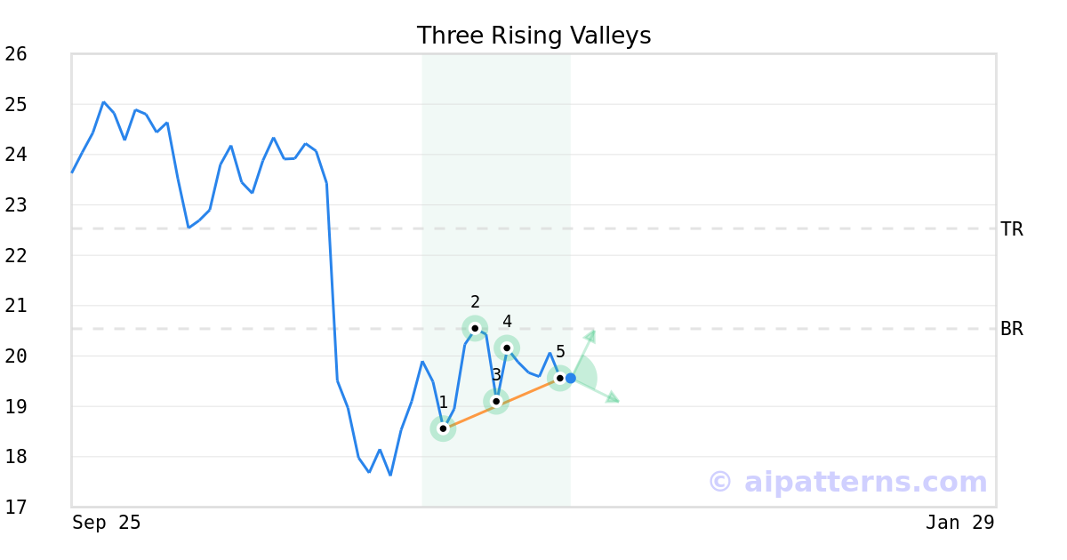 The Three Rising Valleys pattern forms when three minor Lows (1, 3, 5) are arranged along an upward sloping trend line.