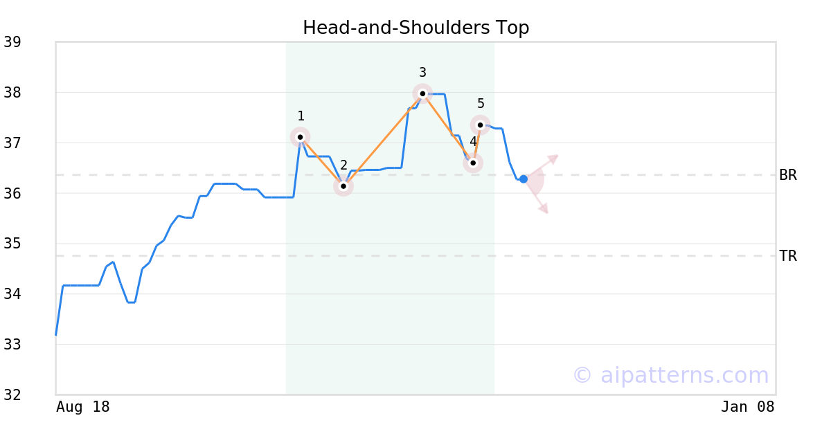 The pattern forms with a center peak (the Head, labeled 3) and left and right Shoulders (1, 5). Eventually the security stops testing highs and reverses trend into a decline.