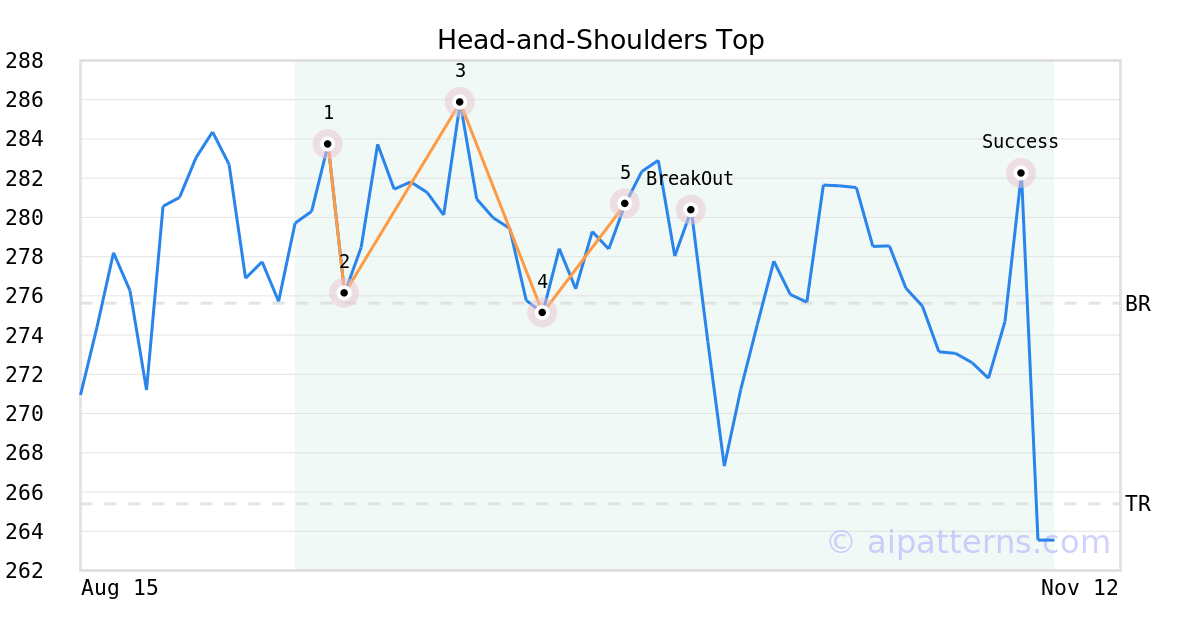 On October 02, 2025, A.I.dvisor detected a Head-and-Shoulders Top Pattern (Bearish) for Watts Water Technologies (WTS, $280.69). 6 days later, on October 08, 2025, A.I.dvisor confirmed the Bearish pattern, setting a target price of the stock. On November 05, 2025, the stock hit the target price of $265.40 – resulting in a gain for traders who shorted the stock on the pattern detection date.