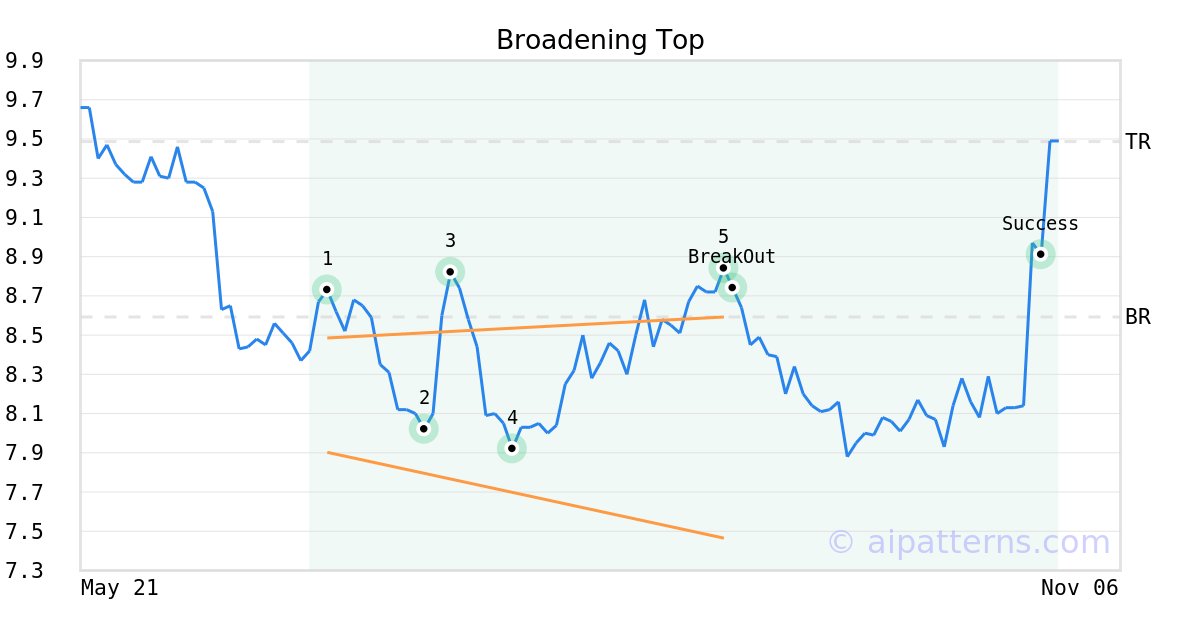 On September 05, 2025, A.I.dvisor detected a Broadening Top Pattern (Bullish) for Western Union Company (The) (WU, $8.59). On September 08, 2025, A.I.dvisor confirmed the Bullish pattern, setting a target price of $9.49. 49 days later, on October 27, 2025, WU reached the target price resulting in a for traders who took a long position in the stock.