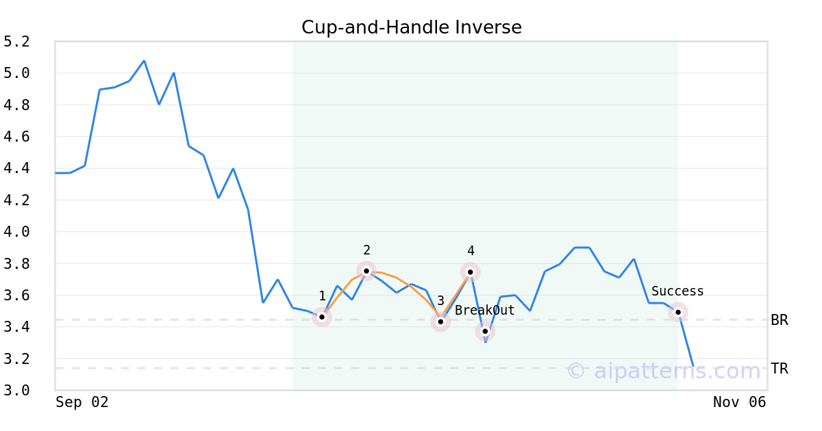 On October 10, 2025, A.I.dvisor detected a Cup-and-Handle Inverse Pattern (Bearish) for Willamette Valley Vineyards (WVVI, $3.74). 3 days later, on October 13, 2025, A.I.dvisor confirmed the Bearish pattern, setting a target price of the stock. On October 30, 2025, the stock hit the target price of $3.14 – resulting in a gain for traders who shorted the stock on the pattern detection date.