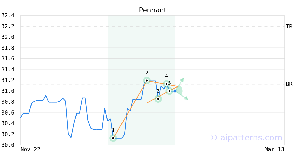 The Rising Pennant forms when rising prices experience a consolidation period, and the price moves within a narrow range defined by the converging lines through points (2, 4) and (3, 5).