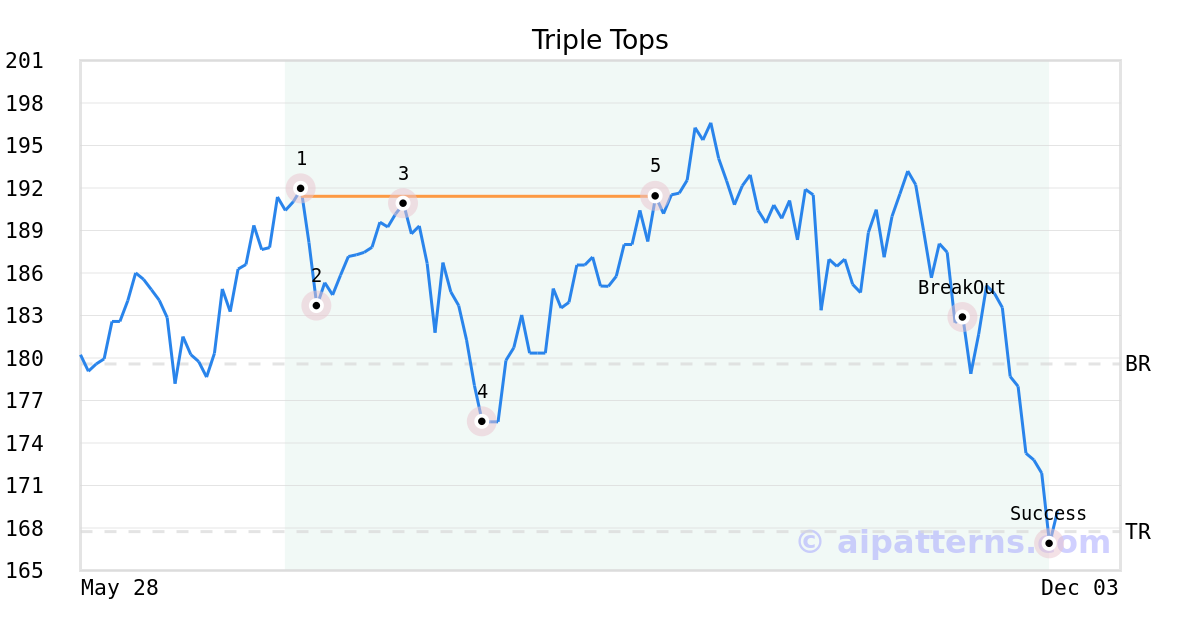 On September 11, 2025, A.I.dvisor detected a Triple Tops Pattern (Bearish) for State Street® SPDR® FctSt Innvtv TechETF (XITK, $191.41). 55 days later, on November 05, 2025, A.I.dvisor confirmed the Bearish pattern, setting a target price of the stock. On November 20, 2025, the stock hit the target price of $167.74 – resulting in a +1 gain for traders who shorted the stock on the pattern detection date.