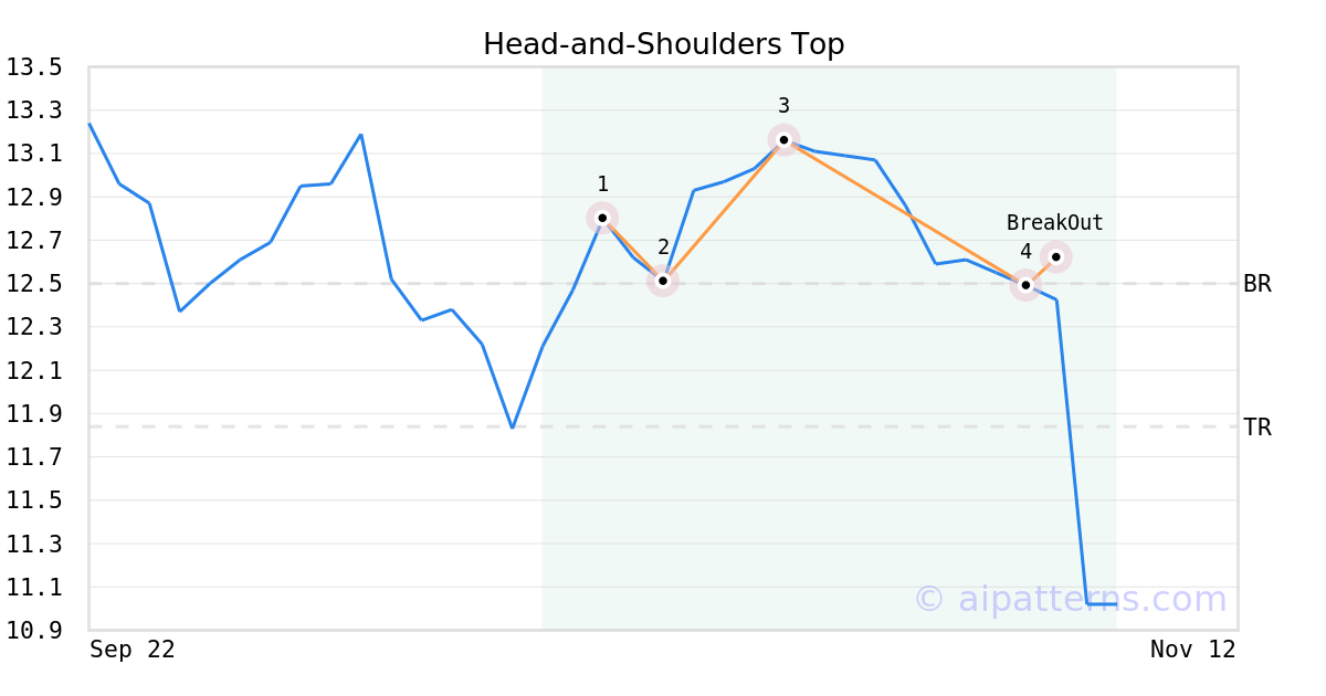 On November 05, 2025, A.I.dvisor detected a Head-and-Shoulders Top Pattern (Bearish) for DENTSPLY SIRONA (XRAY, $12.62). On November 05, 2025, A.I.dvisor confirmed the Bearish pattern, setting a target price of the stock. On November 05, 2025, the stock hit the target price of $11.84 – resulting in a gain for traders who shorted the stock on the pattern detection date.