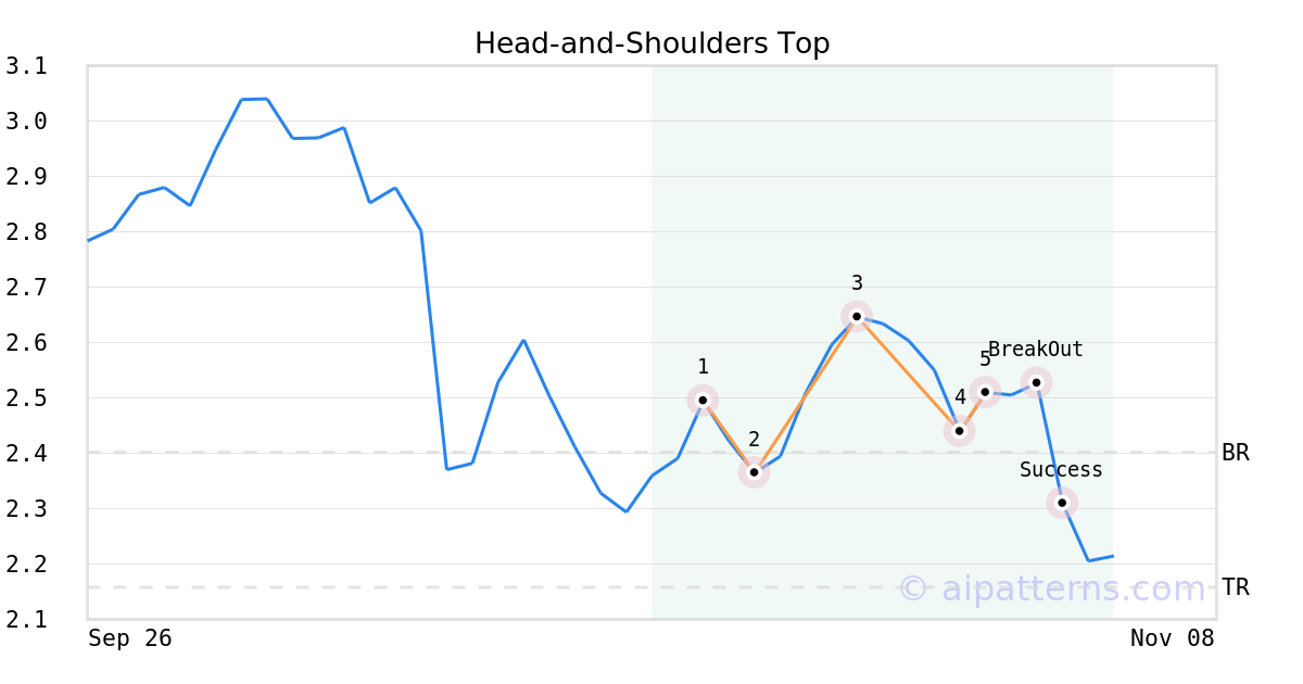 On October 31, 2025, A.I.dvisor detected a Head-and-Shoulders Top Pattern (Bearish) for XRP cryptocurrency (XRP.X, $2.508733). 2 days later, on November 02, 2025, A.I.dvisor confirmed the Bearish pattern, setting a target price of the stock. On November 03, 2025, the stock hit the target price of $2.157900 – resulting in a gain for traders who shorted the stock on the pattern detection date.