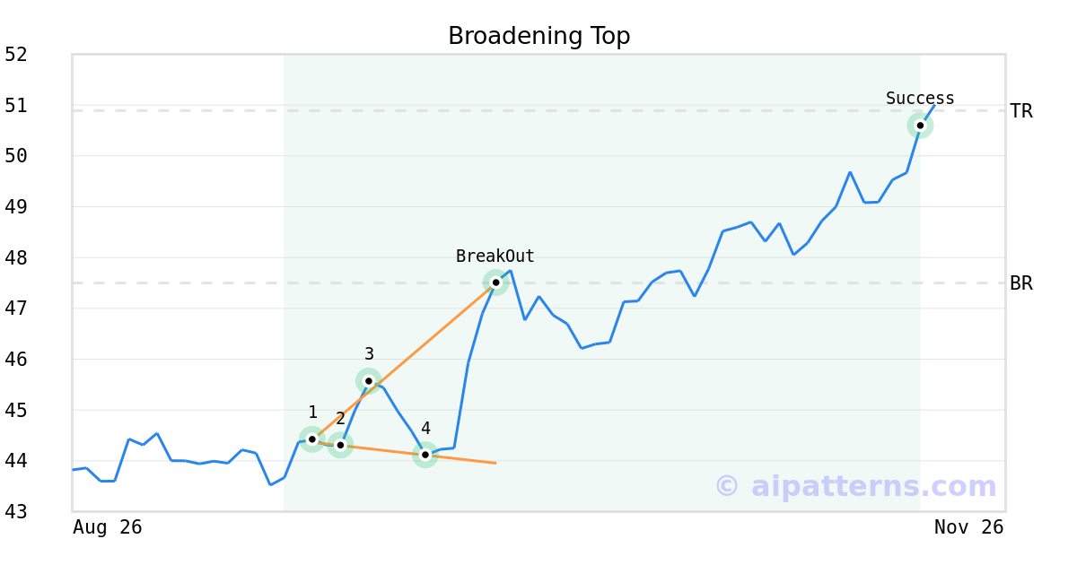 On October 08, 2025, A.I.dvisor detected a Broadening Top Pattern (Bullish) for ProShares UltraShort Yen (YCS, $47.50). On October 08, 2025, A.I.dvisor confirmed the Bullish pattern, setting a target price of $50.89. 42 days later, on November 19, 2025, YCS reached the target price resulting in a for traders who took a long position in the stock.