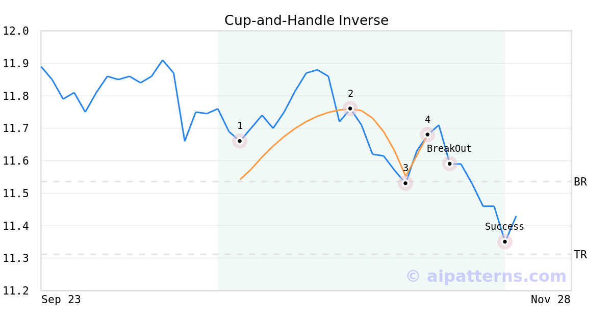 On November 11, 2025, A.I.dvisor detected a Cup-and-Handle Inverse Pattern (Bearish) for Amplify CEF High Income ETF (YYY, $11.68). 2 days later, on November 13, 2025, A.I.dvisor confirmed the Bearish pattern, setting a target price of the stock. On November 20, 2025, the stock hit the target price of $11.31 – resulting in a gain for traders who shorted the stock on the pattern detection date.