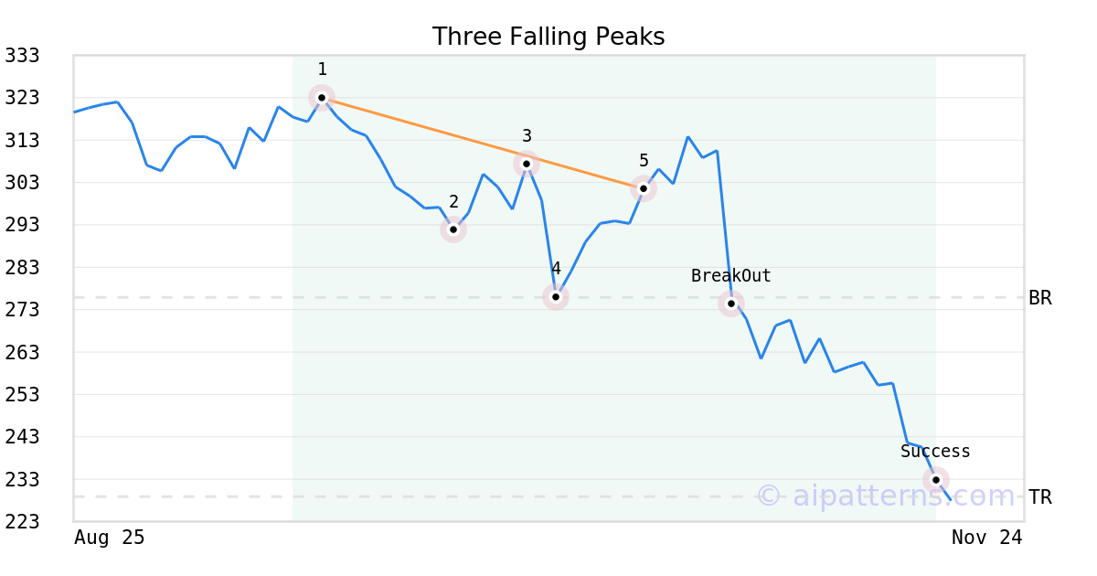 On October 20, 2025, A.I.dvisor detected a Three Falling Peaks Pattern (Bearish) for Zebra Technologies Corp (ZBRA, $301.45). 8 days later, on October 28, 2025, A.I.dvisor confirmed the Bearish pattern, setting a target price of the stock. On November 17, 2025, the stock hit the target price of $228.90 – resulting in a +2 gain for traders who shorted the stock on the pattern detection date.