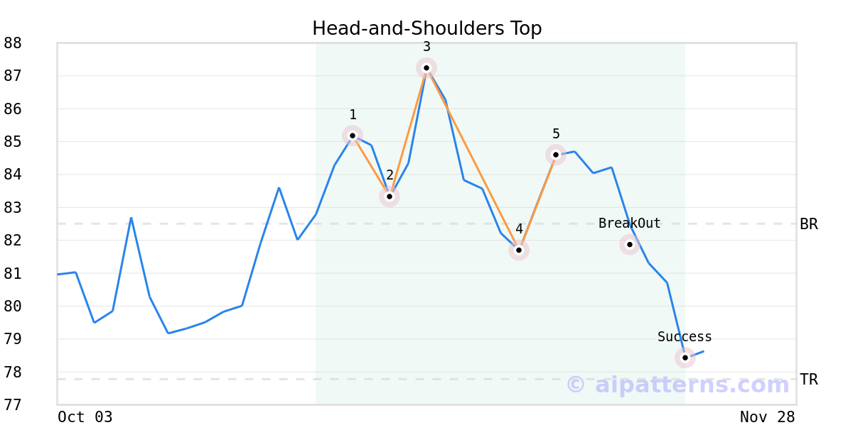 On November 11, 2025, A.I.dvisor detected a Head-and-Shoulders Top Pattern (Bearish) for Zoom Communications Inc (ZM, $84.59). 6 days later, on November 17, 2025, A.I.dvisor confirmed the Bearish pattern, setting a target price of the stock. On November 20, 2025, the stock hit the target price of $77.78 – resulting in a gain for traders who shorted the stock on the pattern detection date.
