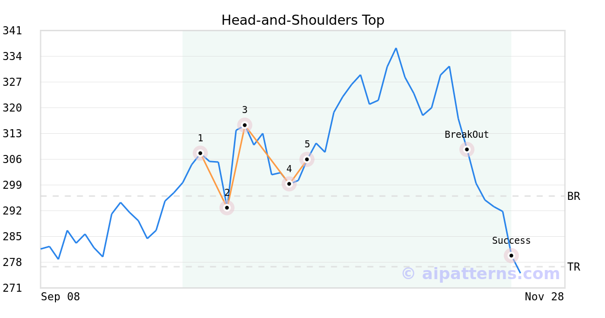 On October 20, 2025, A.I.dvisor detected a Head-and-Shoulders Top Pattern (Bearish) for Zscaler (ZS, $305.90). 24 days later, on November 13, 2025, A.I.dvisor confirmed the Bearish pattern, setting a target price of the stock. On November 20, 2025, the stock hit the target price of $276.78 – resulting in a gain for traders who shorted the stock on the pattern detection date.