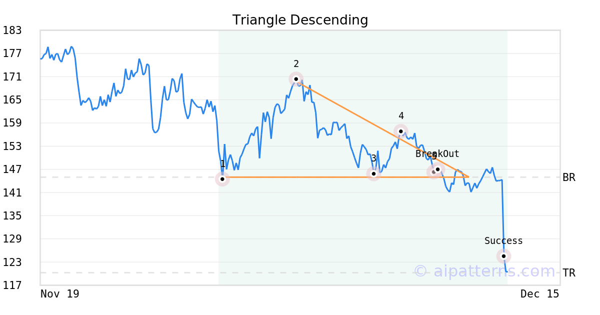 On September 15, 2025, A.I.dvisor detected a Triangle Descending Pattern (Bearish) for ZOETIS (ZTS, $145.74). 2 days later, on September 17, 2025, A.I.dvisor confirmed the Bearish pattern, setting a target price of the stock. On November 04, 2025, the stock hit the target price of $120.25 – resulting in a +1 gain for traders who shorted the stock on the pattern detection date.